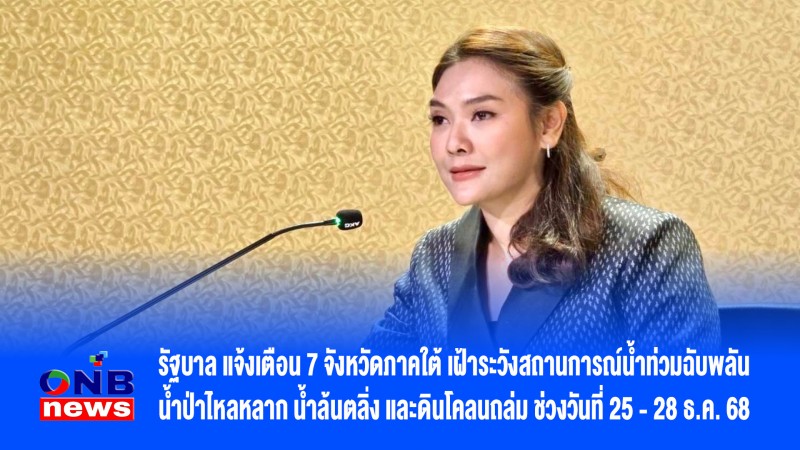 รัฐบาล แจ้งเตือน 7 จังหวัดภาคใต้ เฝ้าระวังสถานการณ์น้ำท่วมฉับพลัน น้ำป่าไหลหลาก น้ำล้นตลิ่ง และดินโคลนถล่ม ช่วงวันที่ 25 - 28 ธ.ค. 68