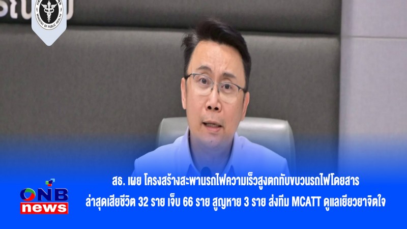 สธ. เผย โครงสร้างสะพานรถไฟความเร็วสูงตกทับขบวนรถไฟโดยสาร ล่าสุดเสียชีวิต 32 ราย เจ็บ 66 ราย สูญหาย 3 ราย ส่งทีม MCATT ดูแลเยียวยาจิตใจ